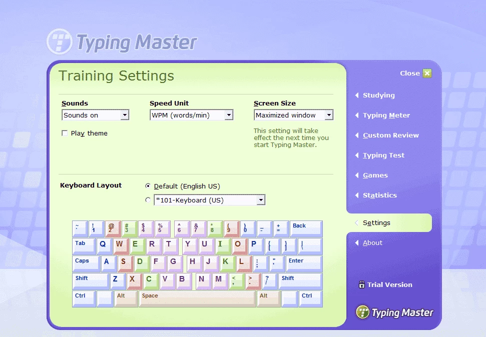 このアプリは複数のトレーニングセッションを提供するだけでなく、1分、2分、5分、10分といった様々な時間枠で、優れたタイピングテストも提供しています。これらのテストでは、1分間の単語数(WPM)と1分間のキーストローク数(KPM)を測定できます。テスト結果は、正確性、総ネット速度、詳細な進捗レポートの表示に役立ち、卒業証書の印刷オプションも用意されています。また、ユーザーは、個人に合わせた模擬試験のために、カスタムテストテキストを利用することもできます。